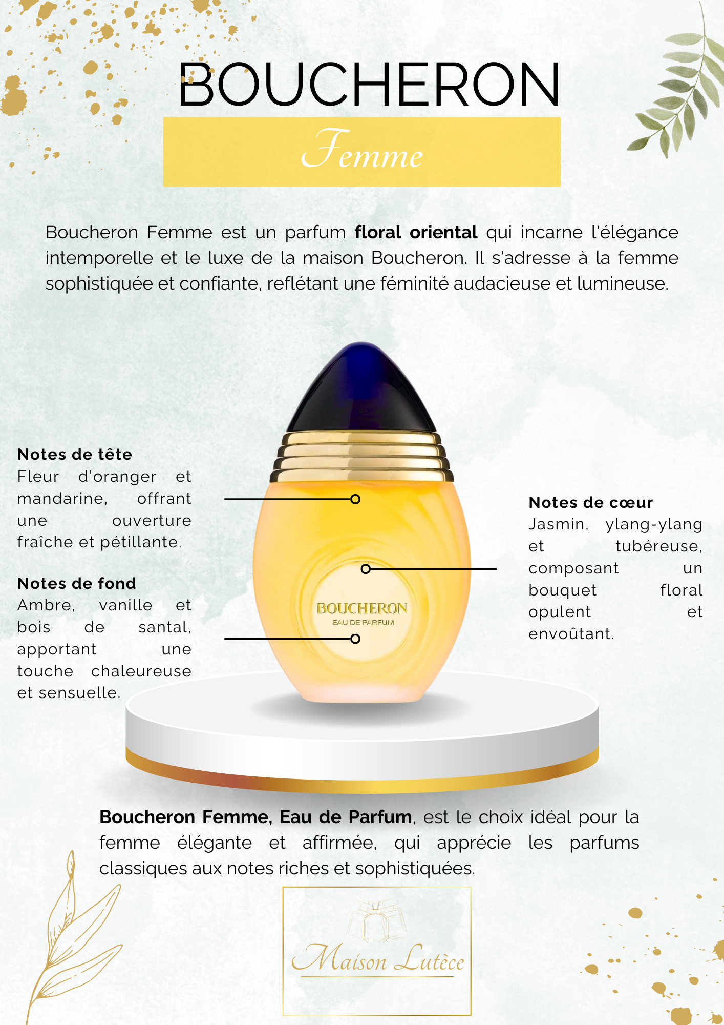 Boucheron Femme s’adresse aux femmes élégantes, confiantes et amoureuses des classiques intemporels. Il plaira à celles qui recherchent une signature olfactive riche, luxueuse et pleine de caractère.