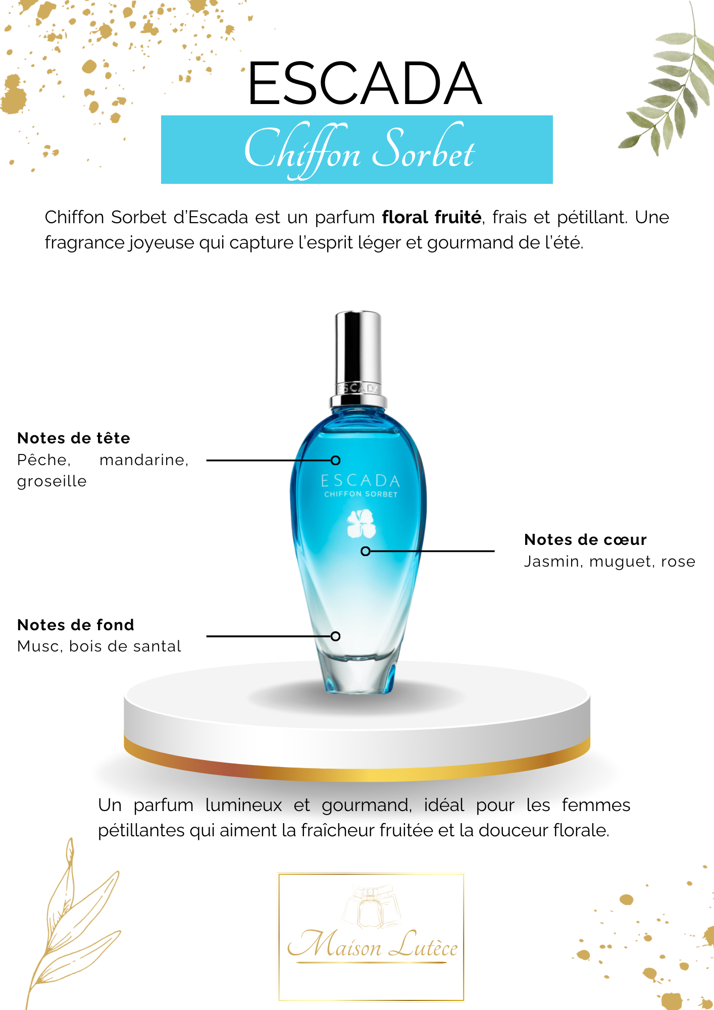 Chiffon Sorbet d’Escada est une fragrance vive et délicieuse, qui mêle la gourmandise des fruits juteux à la douceur des fleurs. Un parfum léger et lumineux, parfait pour rayonner avec élégance et insouciance durant la belle saison.