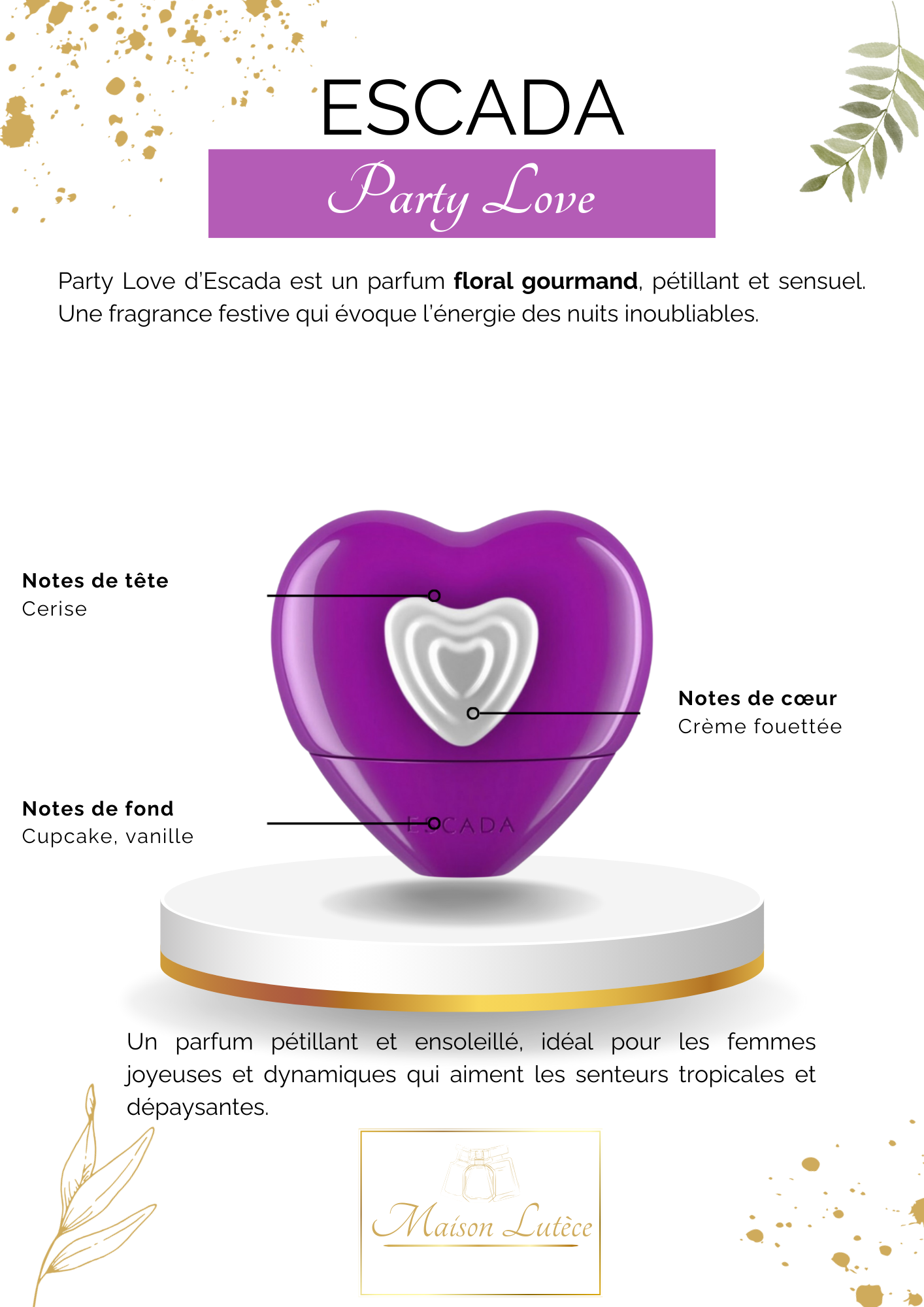 Party Love d’Escada est une explosion de douceur : la cerise sucrée s’unit à la crème fouettée au cœur, sur un lit irrésistible de cupcake vanillé. Un parfum délicieusement gourmand qui évoque joie, fête et plaisir olfactif.
