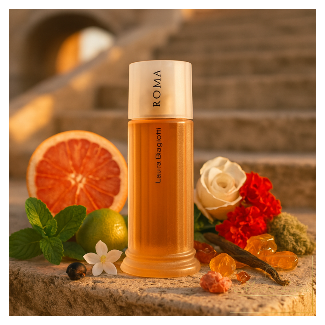 Roma de Laura Biagiotti est un classique intemporel qui s’ouvre sur une fraîcheur vibrante de pamplemousse, menthe et cassis, évolue vers un cœur floral élégant, pour s’installer sur un fond riche de résines, bois nobles et vanille. Une signature olfactive qui charme et marque les esprits.